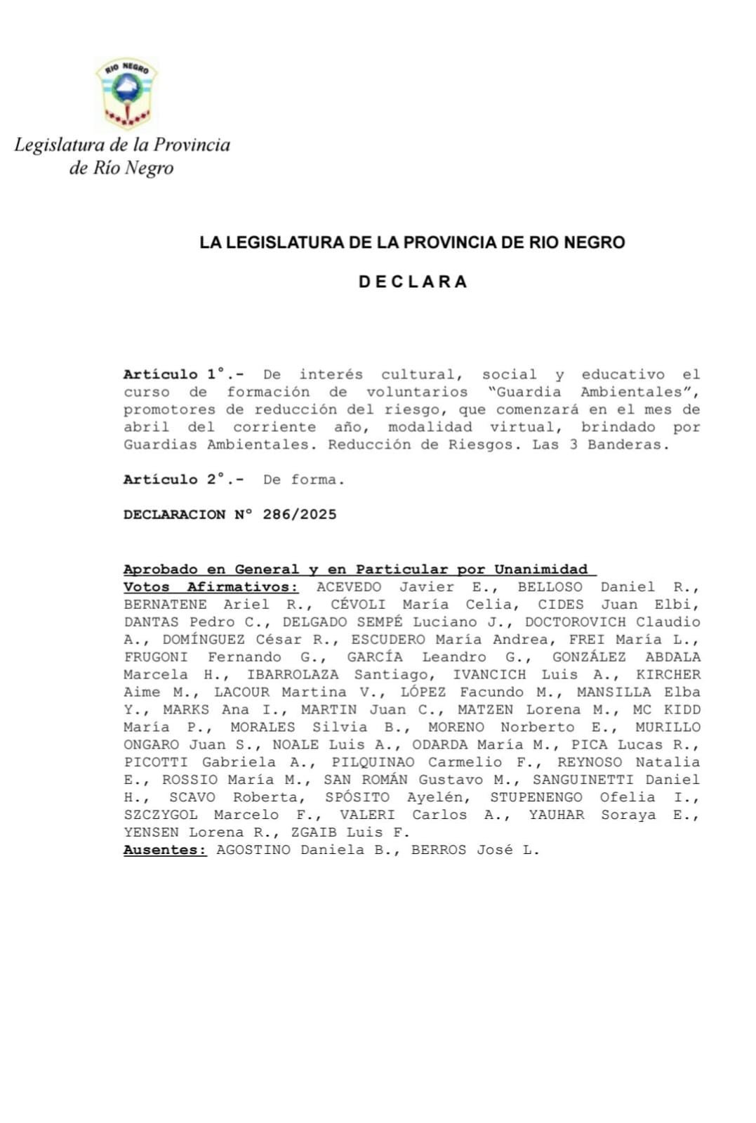 Viedma, Río Negro – EL 22 de mayo pasado, el proyecto «Guardas Ambientales, promotores de reducción del riesgo» fue declarado de Interés Legislativo en la provincia de Río Negro. Esta importante iniciativa, que busca formar voluntarios para la reducción del riesgo en el territorio nacional, recibió un decisivo impulso gracias a la labor del Dr. Ramón Chiocconi, impulsor del proyecto en la provincia y del legislador Leandro García.